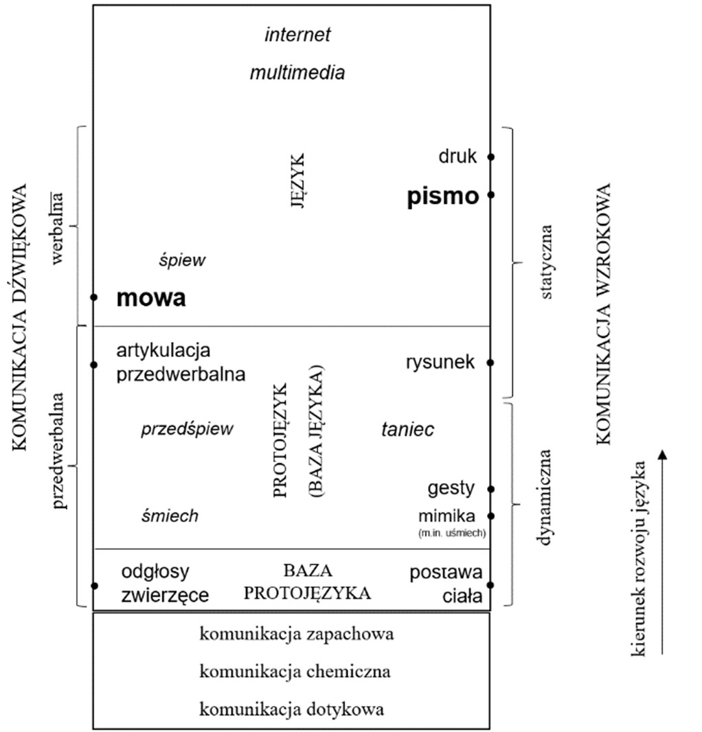 - Język ludzki opiera się na dwóch równoległych szlakach komunikacyjnych – dźwiękowym oraz wzrokowym – które z czasem utworzyły mowę i jej graficzną reprezentację pismo. W genezie języka można wskazać trzy etapy ewolucyjne: 1) etap rozwoju bazy dla protojęzyka (odgłosy zwierzęce i postawa ciała zwierząt); 2) etap rozwoju protojęzyka jako bazy dla powstania języka (przedśpiew, artykulacja przedwerbalna, mimika, gesty, później rysunek) i 3) etap rozwoju właściwego języka (mowa i pismo wraz ze śpiewem, drukiem, multimediami, internetem etc.). Oto jak wyglądała droga do ukształtowania się języka: