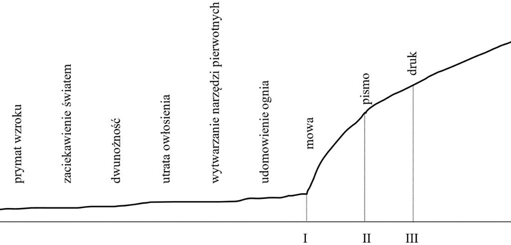 - Język jest niewątpliwie najdoskonalszym uzewnętrzniającym nas narzędziem, ale nie naszym (s)twórcą. Jest nim bowiem nasz własny umysł, który po 4 mld lat ewolucji osiągnął etap wymiany myśli oraz ich gromadzenia, również poza własnym organizmem. Wraz z pojawieniem się mowy zaczęliśmy „przechowywać” nasze myśli także w mózgach innych osób, a jednocześnie gromadzić w swoich mózgach cudze myśli dzięki ich wielostronnej wymianie. Wcześniej, bez posługiwania się językiem, było to prawie niemożliwe. Język odręcznie pisany – druga megarewolucja kognitywna w dziejach ludzkości – ułatwił nam elitarną wymianę myśli oraz ich przechowywanie na nośnikach pozaneuronalnych, takich jak tabliczka gliniana, papirus czy papier. Druk okazał się kolejną, tym razem zdecydowanie bardziej egalitarną megarewolucją w przekazie, gromadzeniu i przechowywaniu myśli.